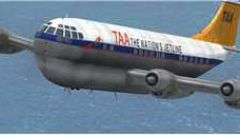 Depiction of the fictional TAA Boeing 377 Stratocruiser during flight.